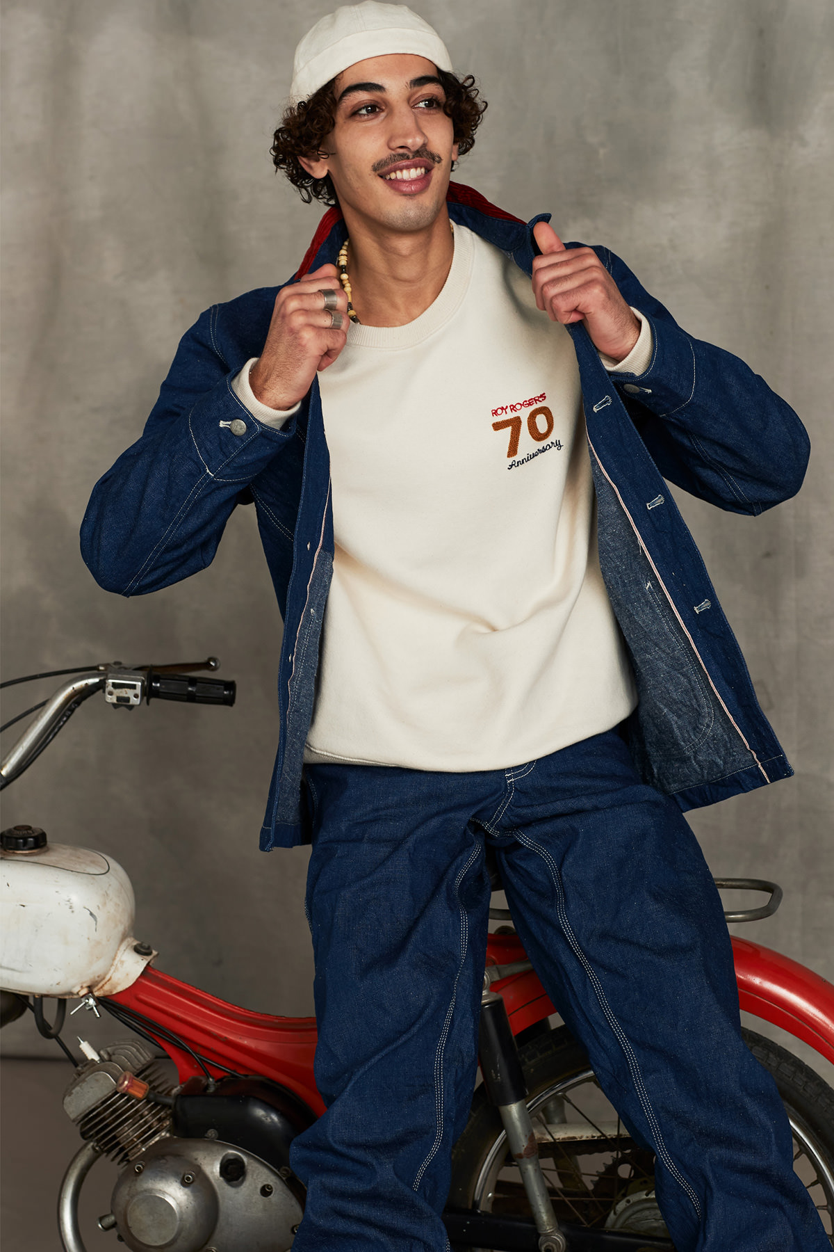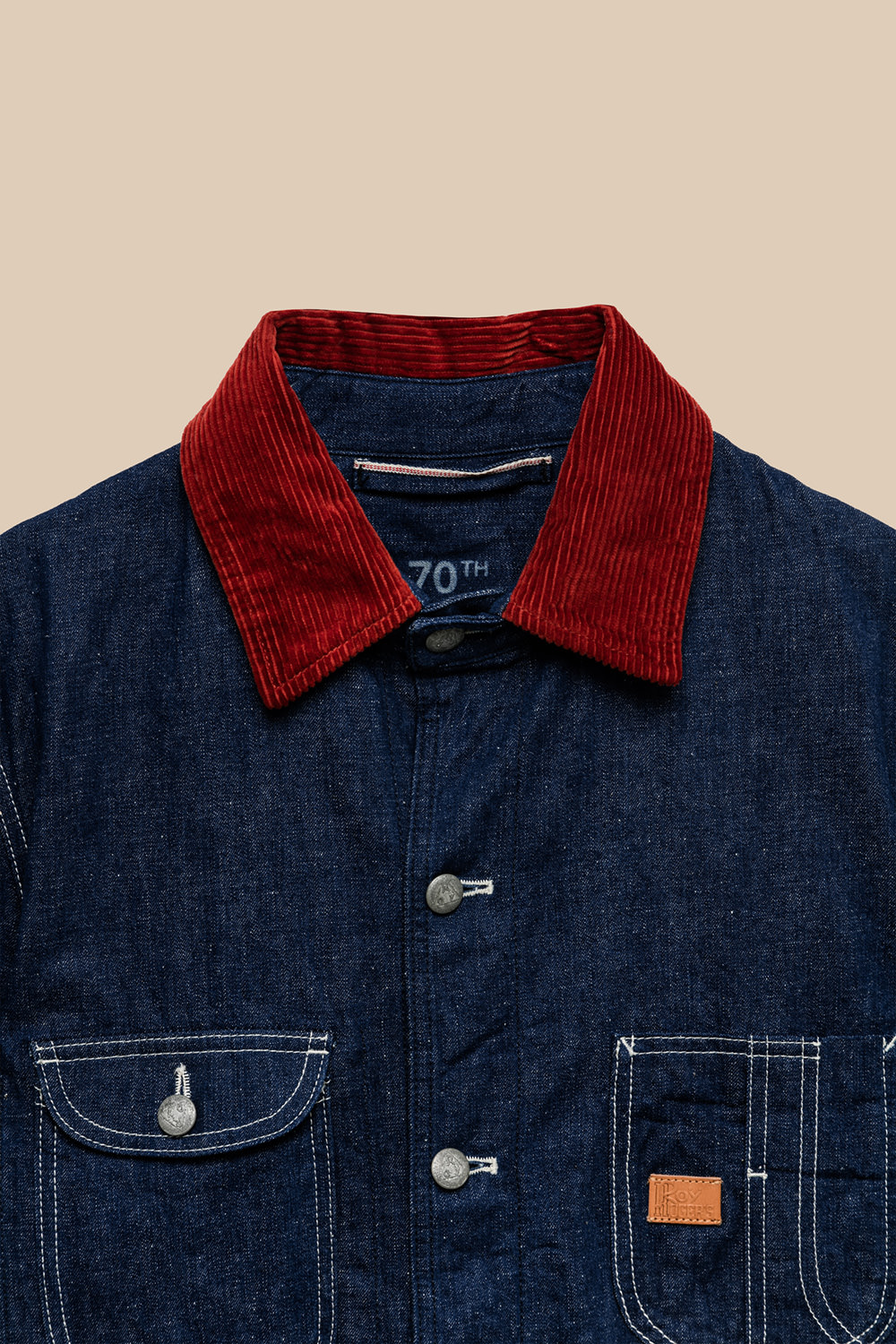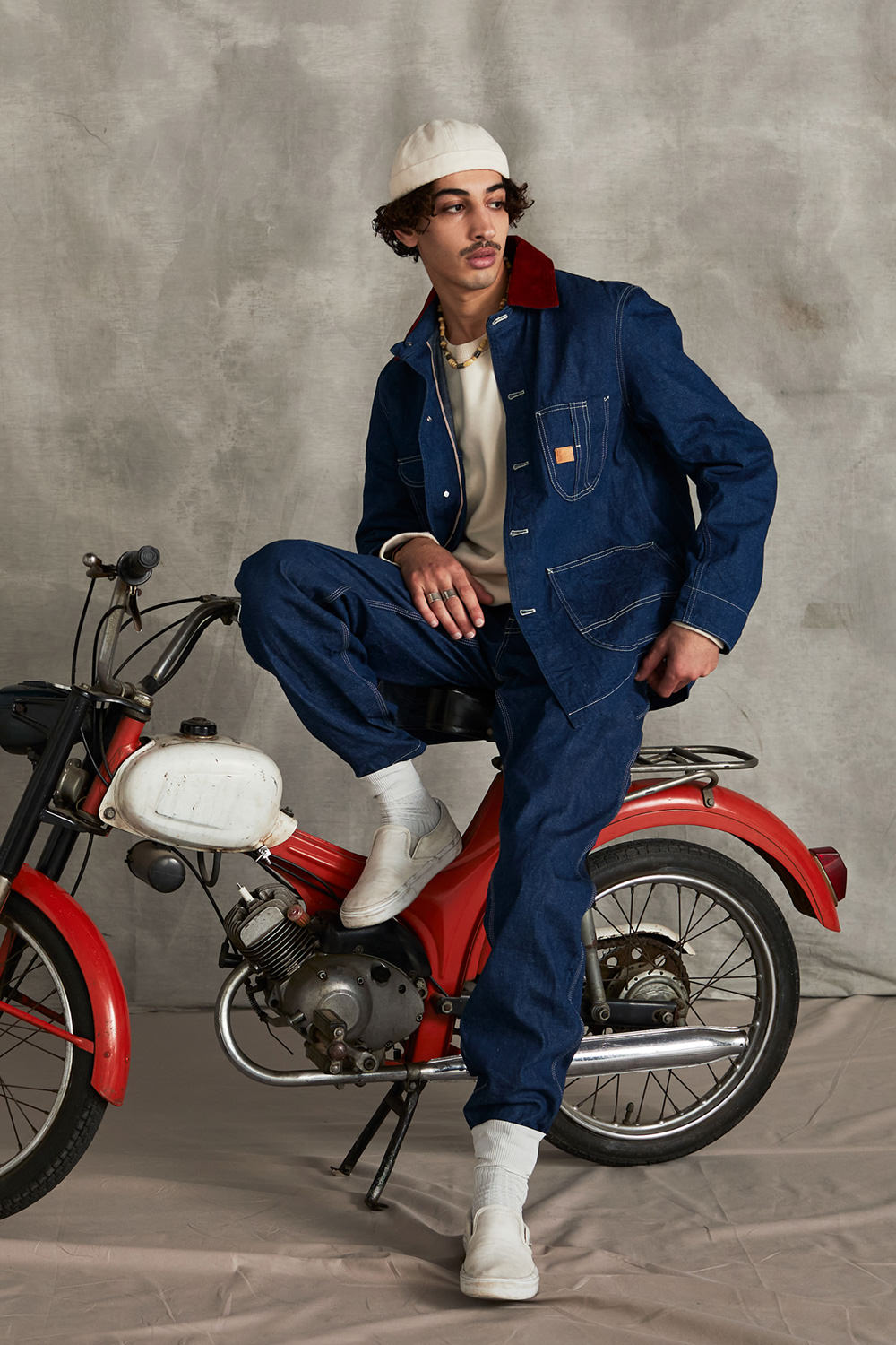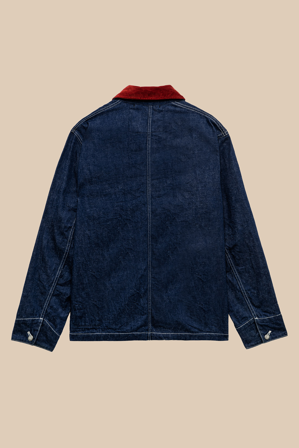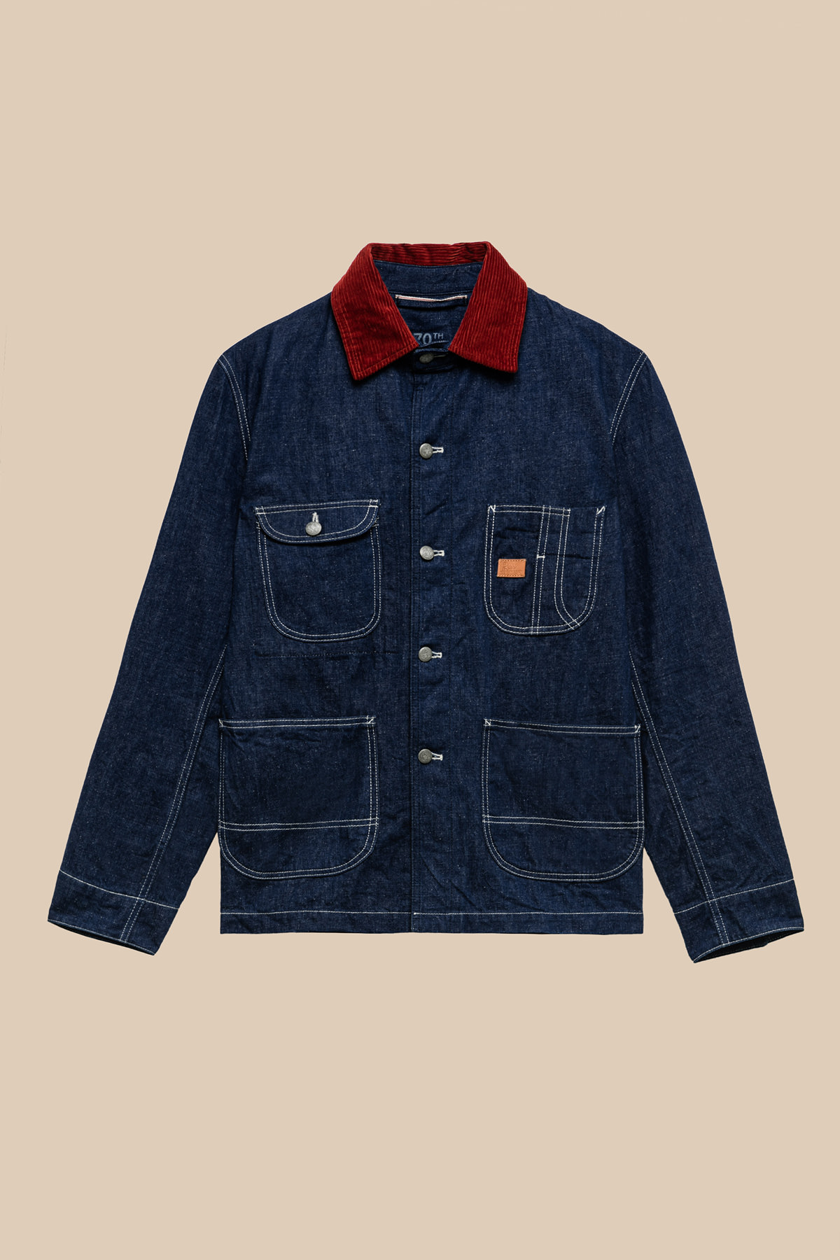 Prison jacket with a red velvet collar inspired by the 60s. An in-depth study was carried out on the choice of fabric leading to the use of 2x1 selvedge denim (which allows for a more open construction than the classic 5-pocket jeans) a typical feature of workwear. This type of fabric is very resistant yet soft at the same time.