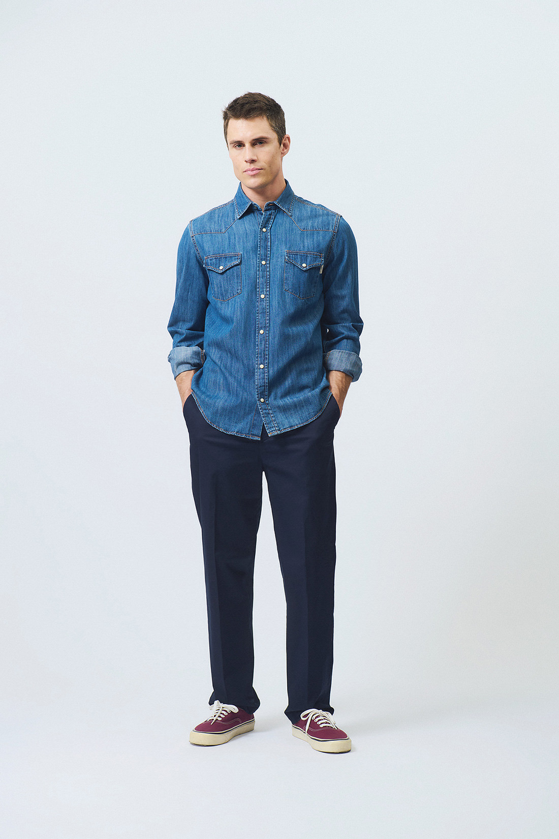 - Chino Pants in solid color washed gabardine.