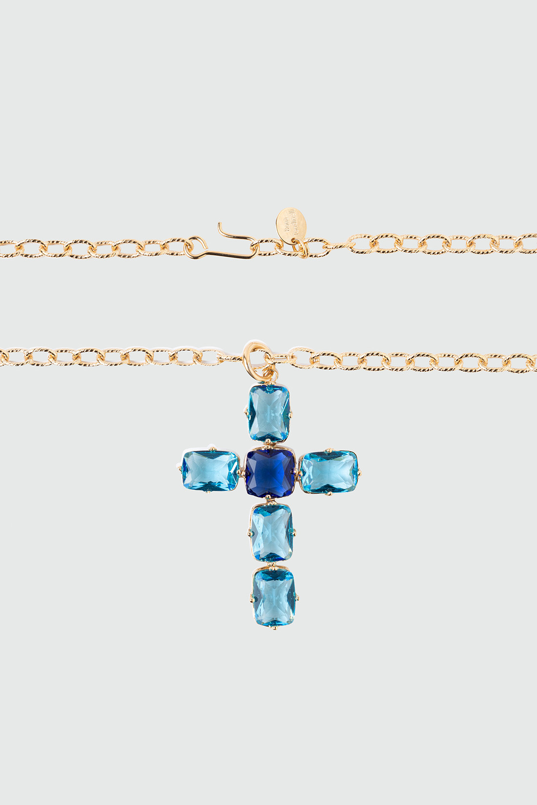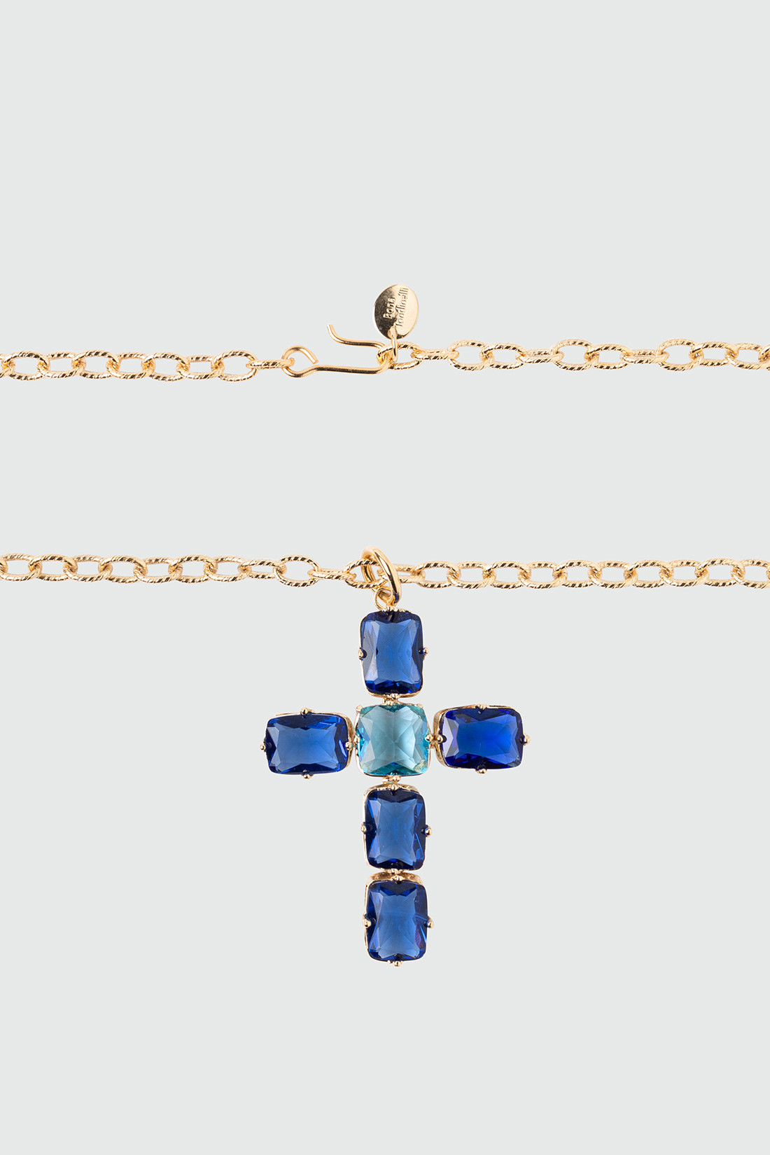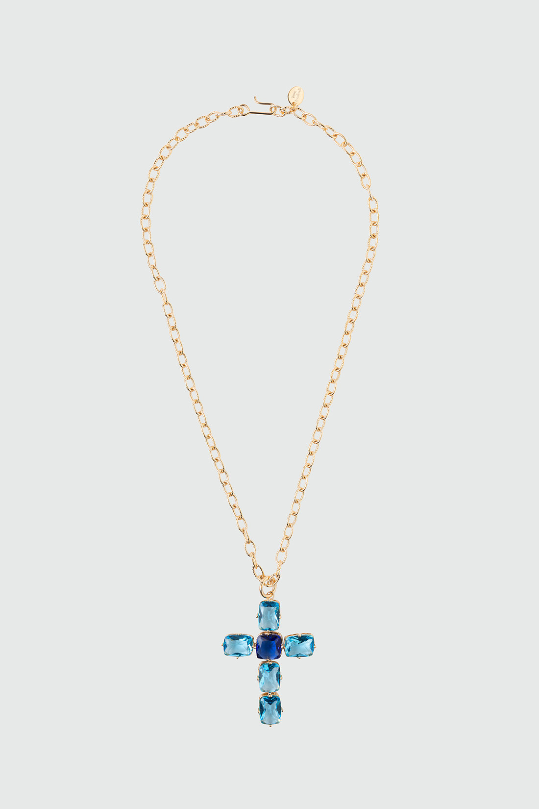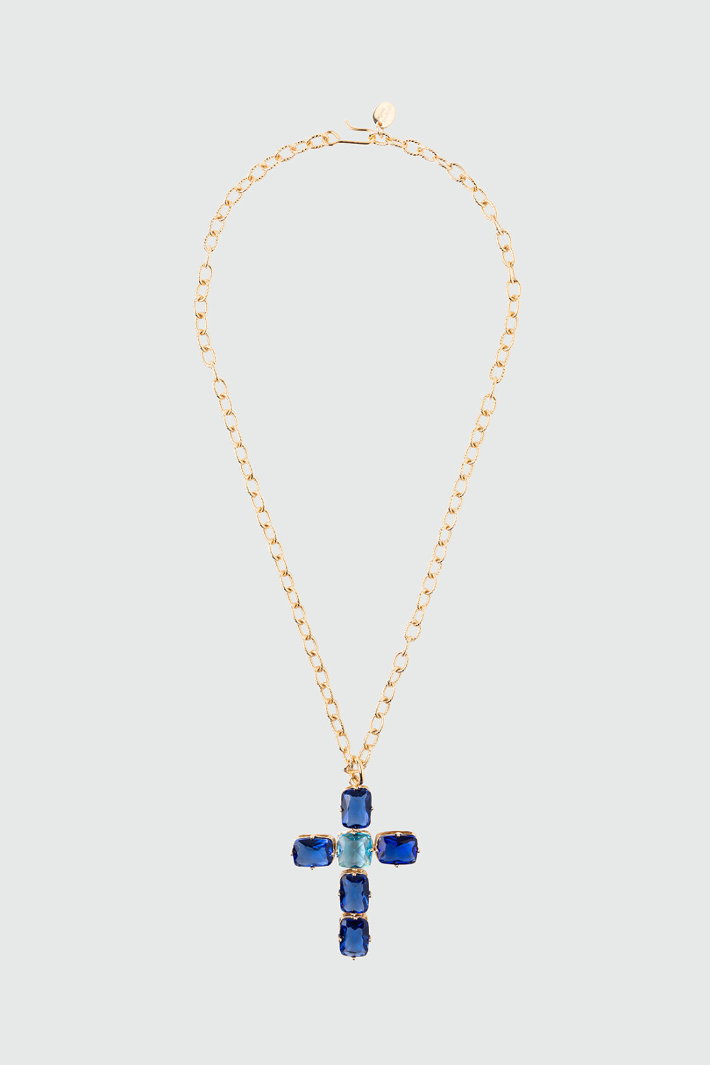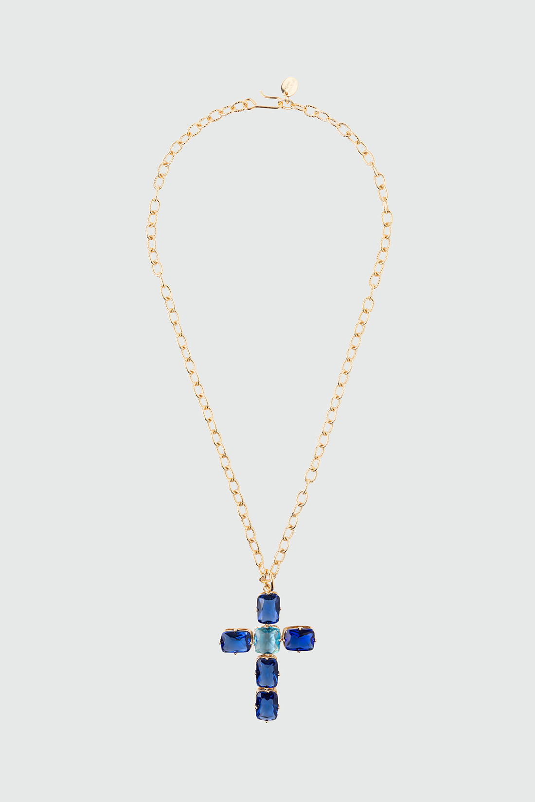 - Chain necklace with a gold-plated brass cross pendant adorned with large blue crystals for a classic yet eccentric look.