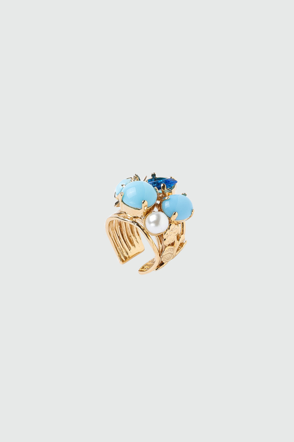 - It features a band structure in gold-plated brass adorned with floral reliefs pearls and bright red crystals.
