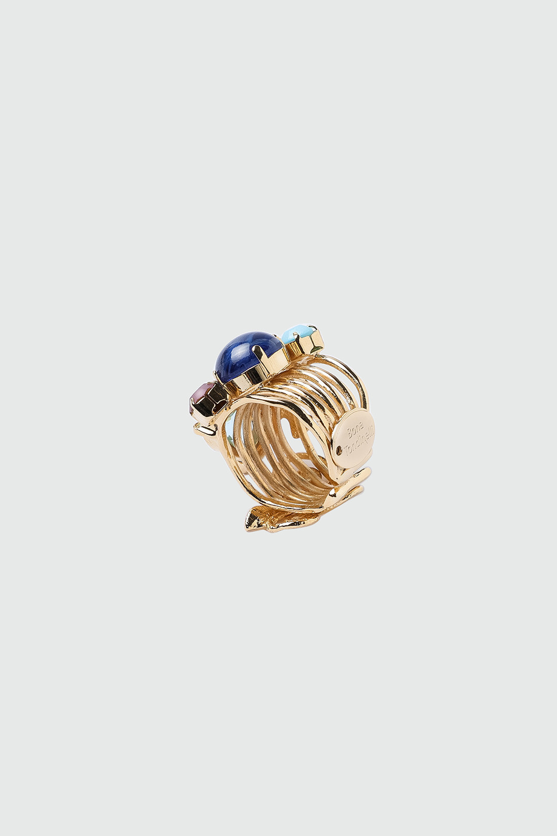 - It features a band structure in gold-plated brass adorned with floral reliefs pearls and bright red crystals.