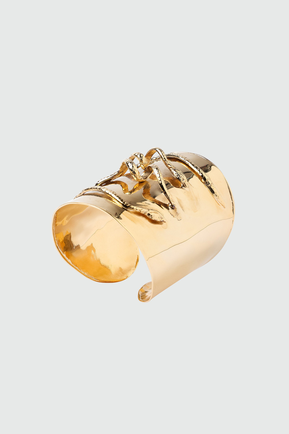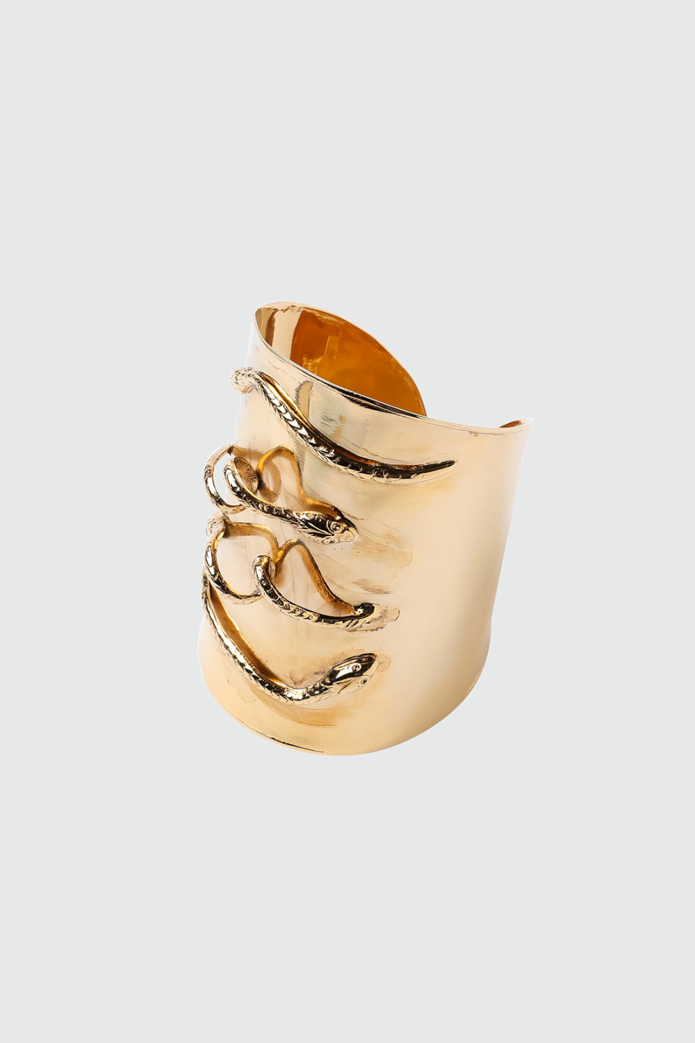- It features a high-band structure in gold-plated brass decorated with raised snakes on the front evoking the Hellenic world.