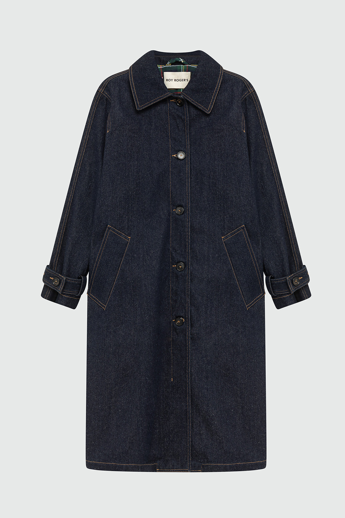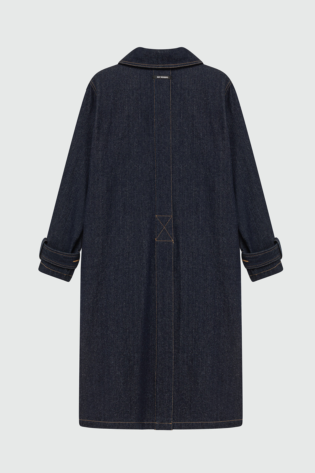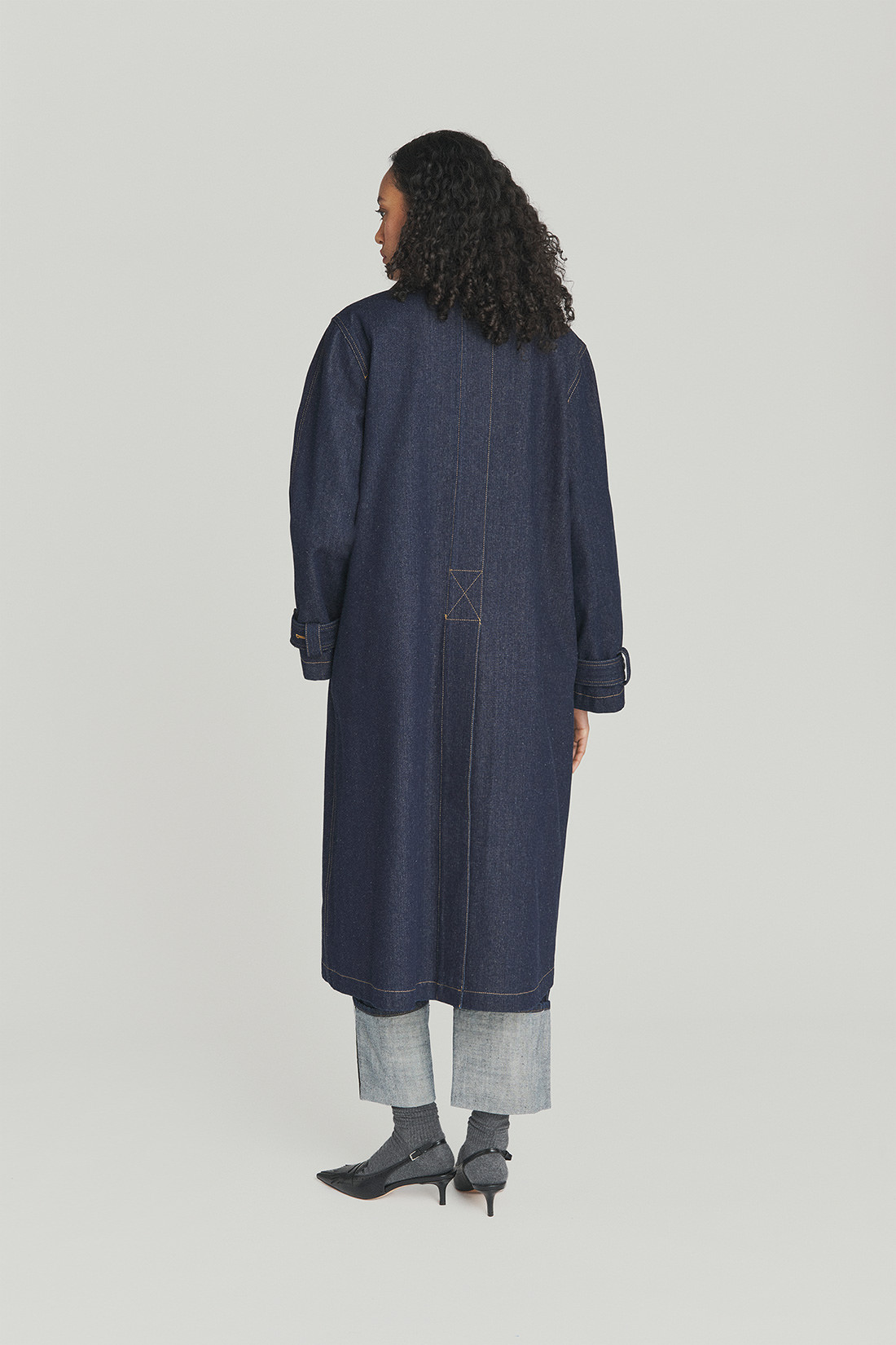 - Storm trench in denim con lavaggio scuro e impunture in contrasto.