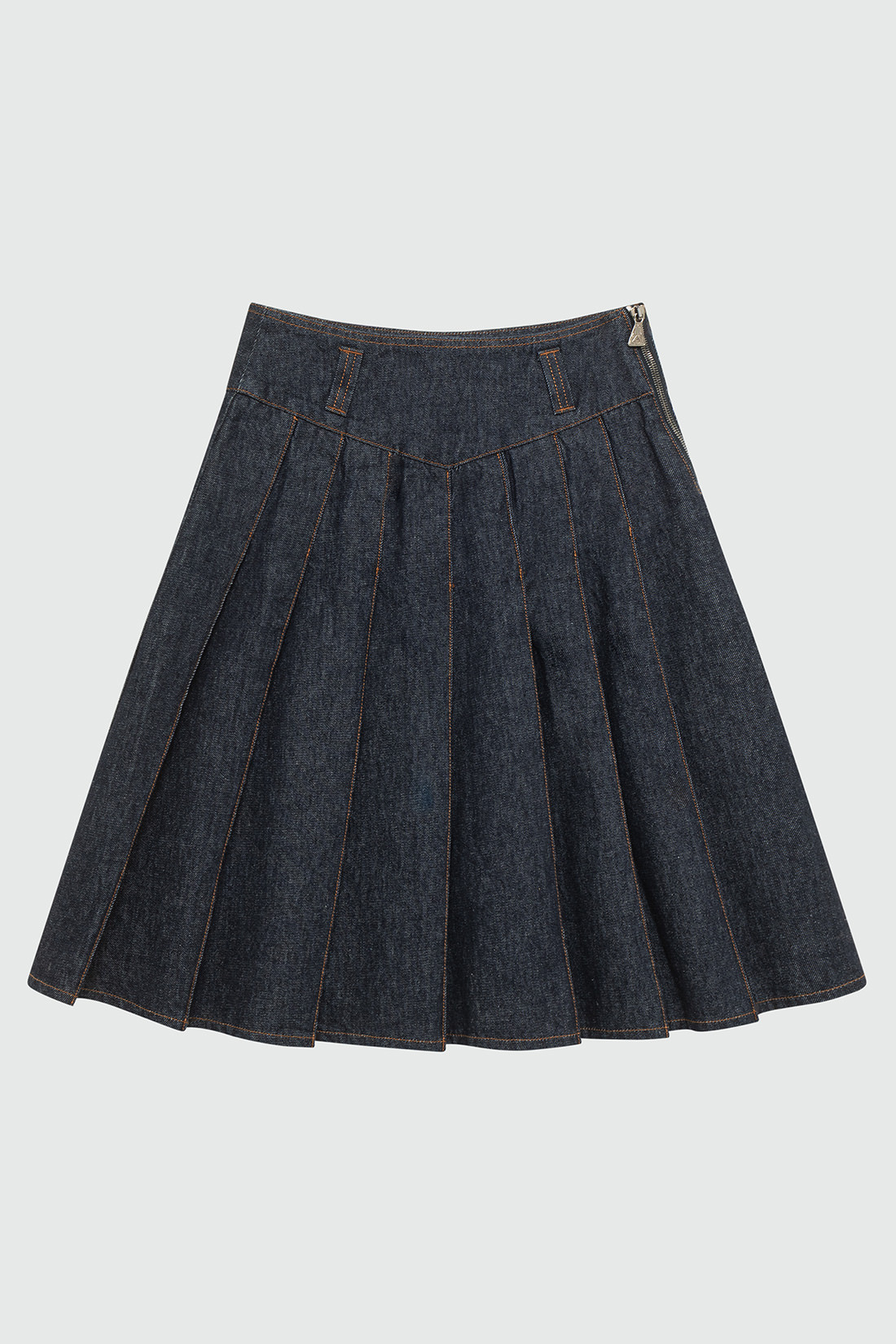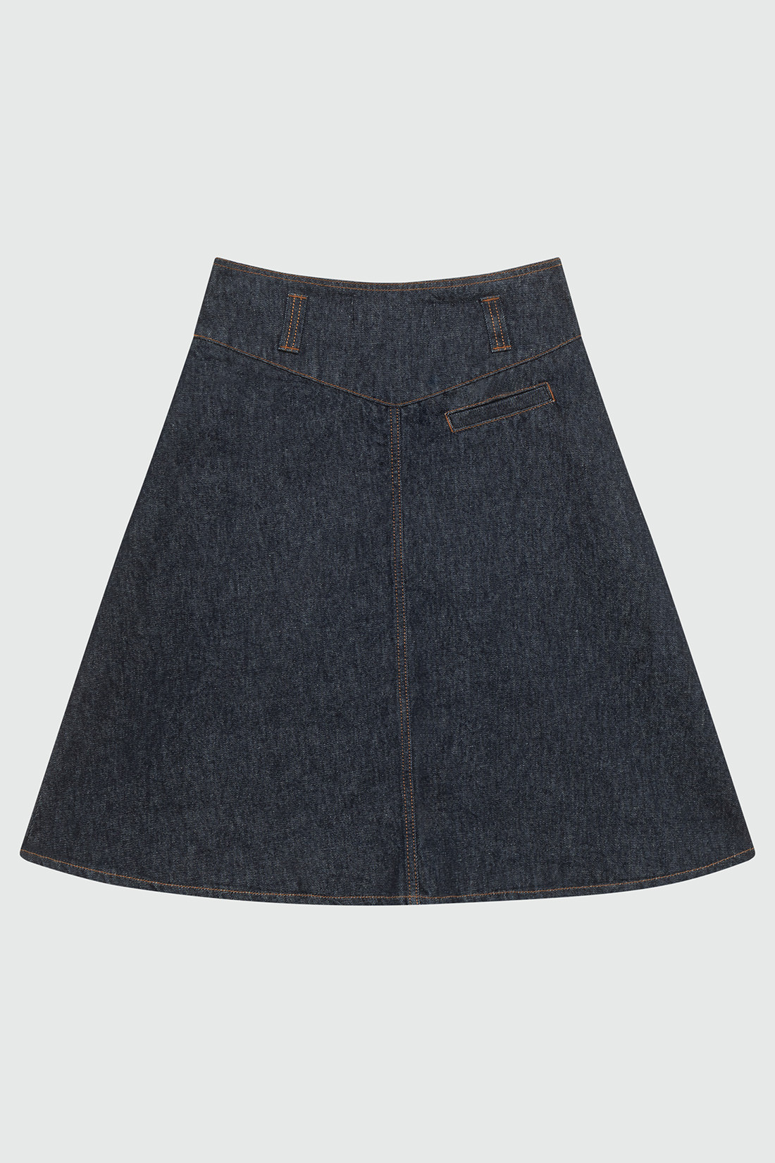 - Gonna Sally in denim rinse con lavaggio scuro e impunture in contrasto.