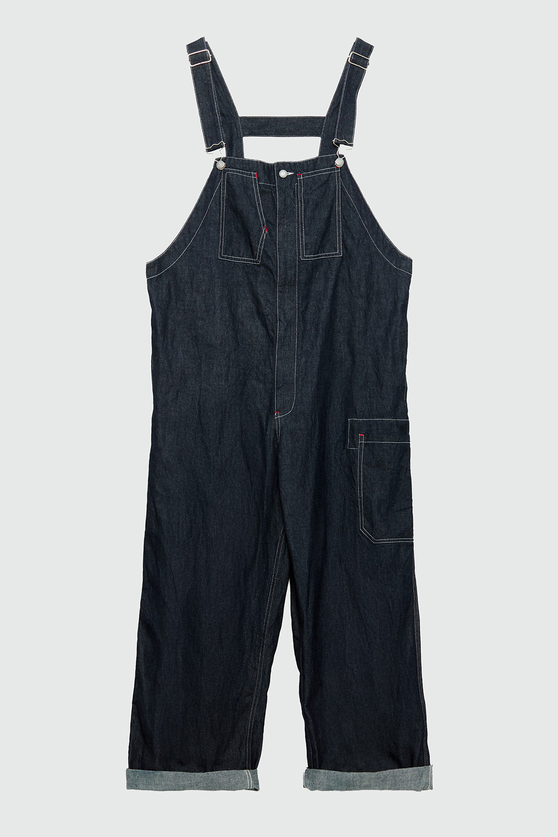 - Salopette in denim rinse con lavaggio scuro e impunture in contrasto.
