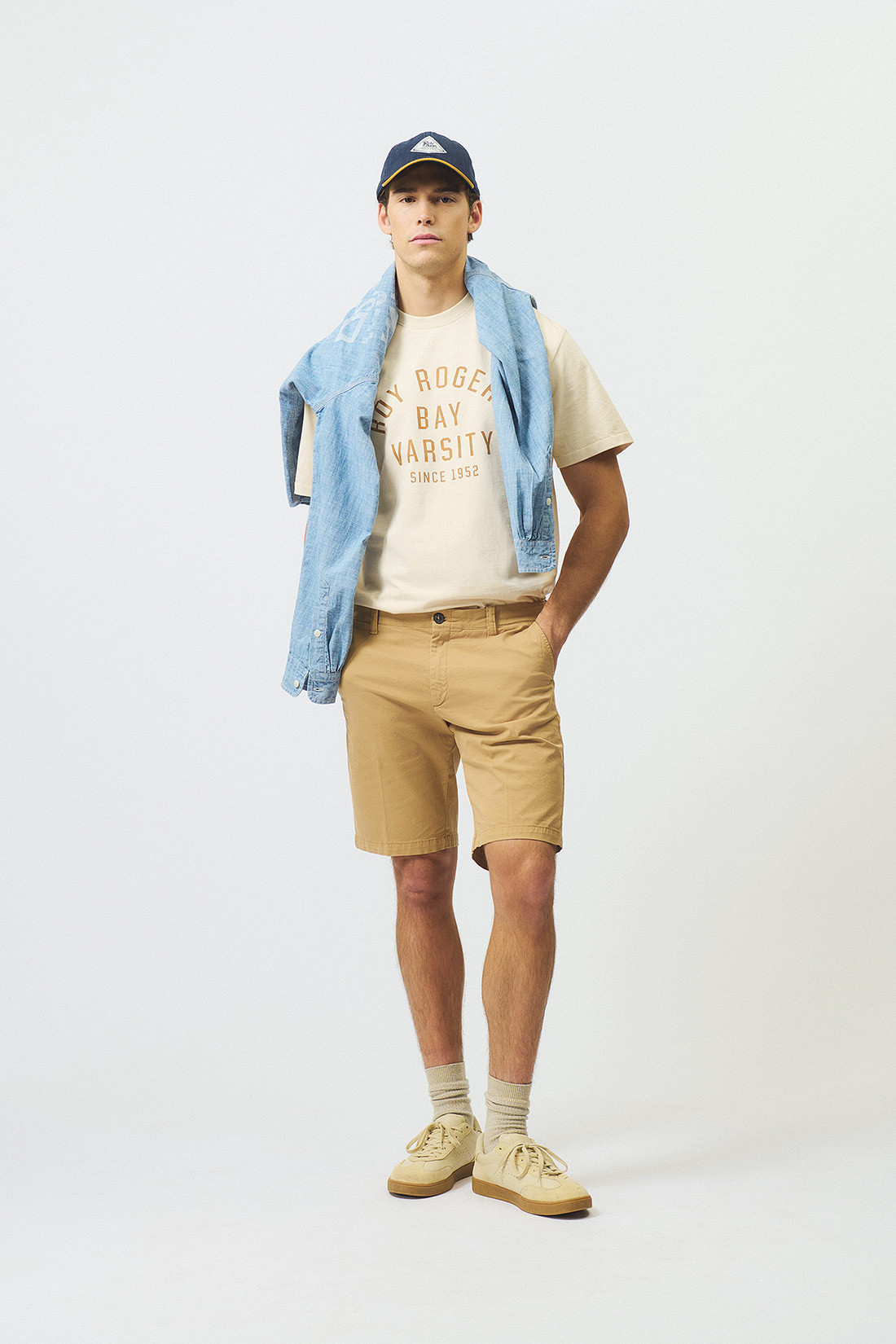 - Due tasche all'americana sul fronte e due tasche a filetto sul retro con bottone.