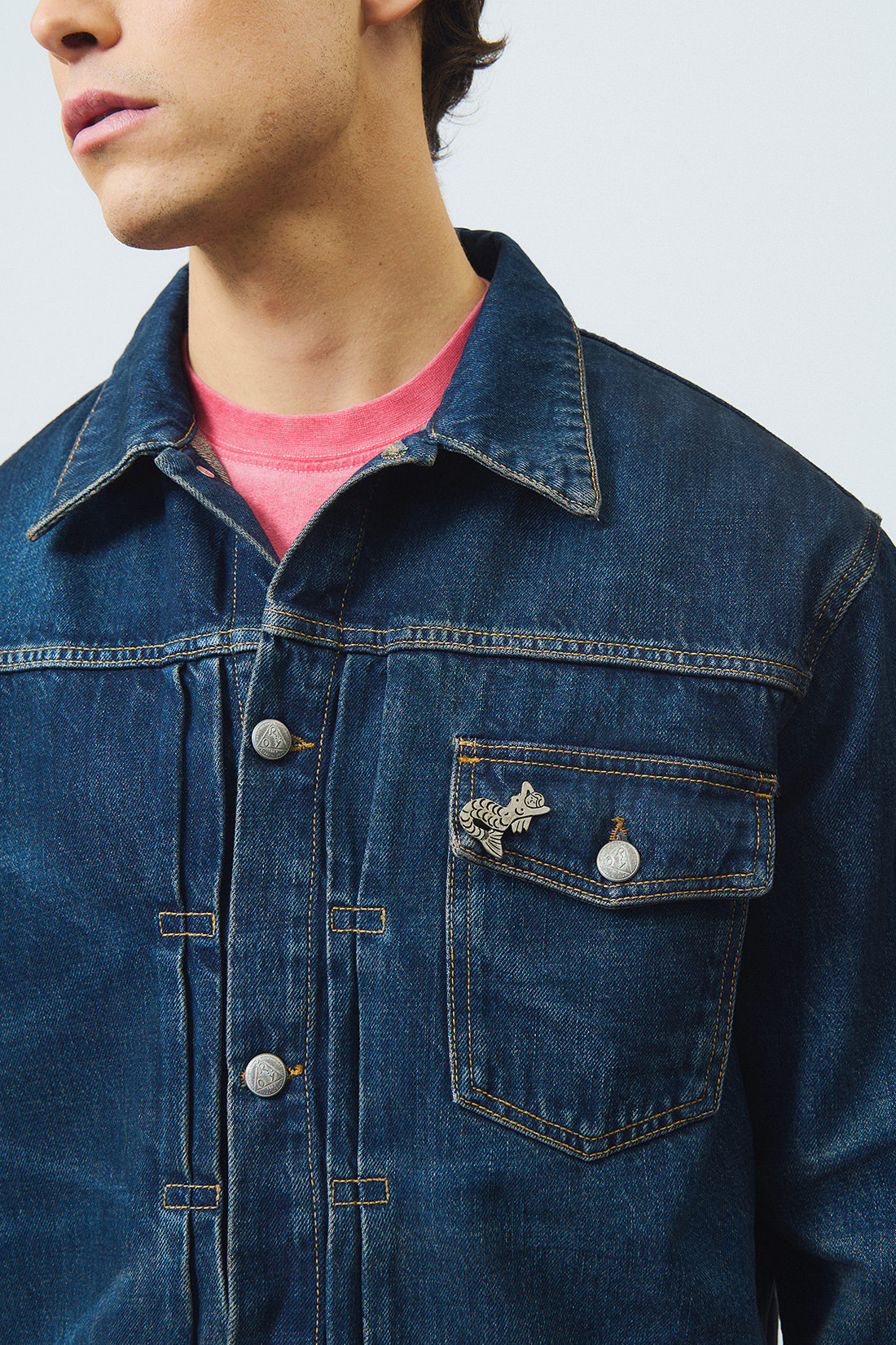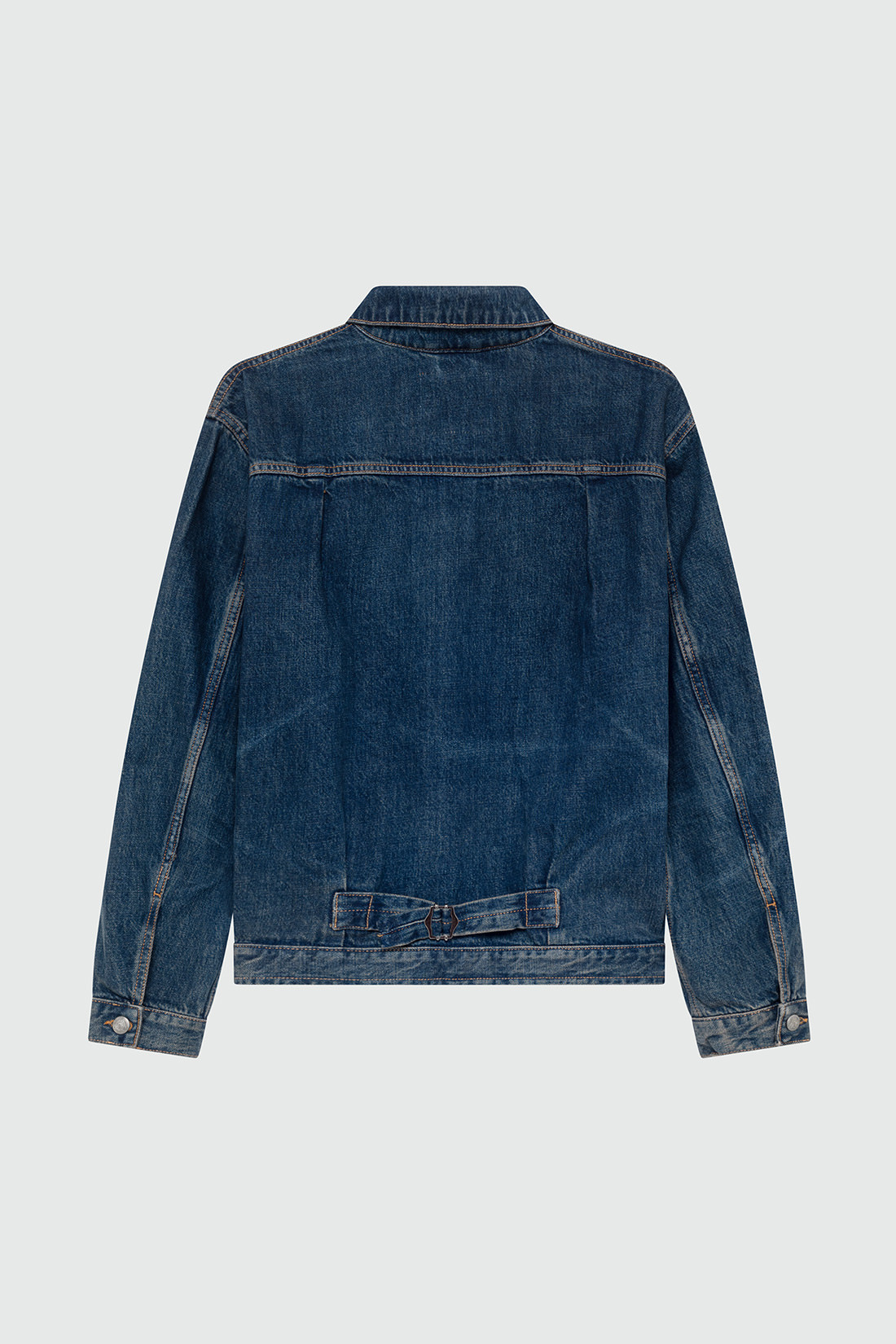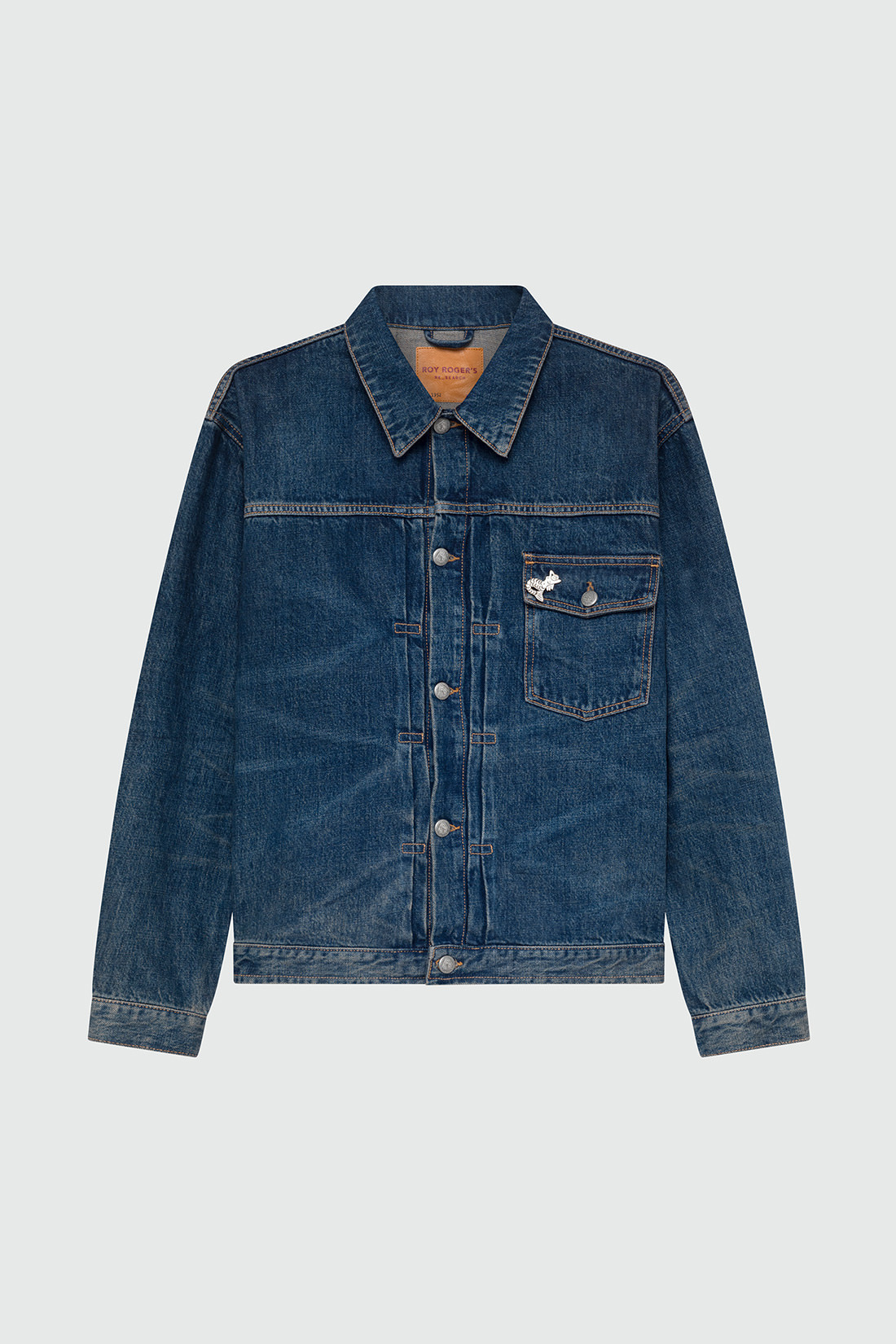 - Giacca in denim Re-search con lavaggio scuro e impunture in contrasto.