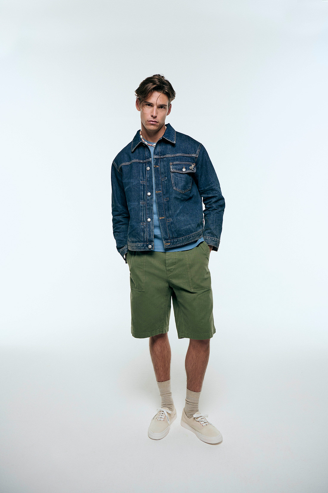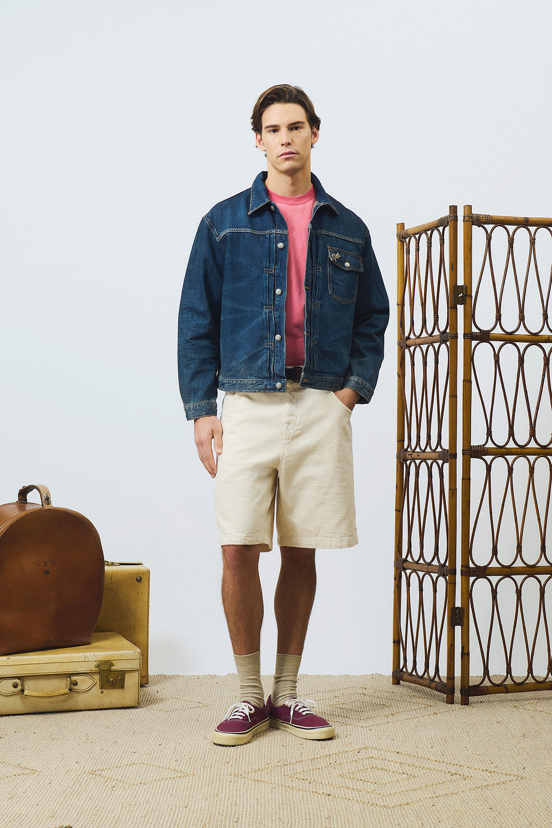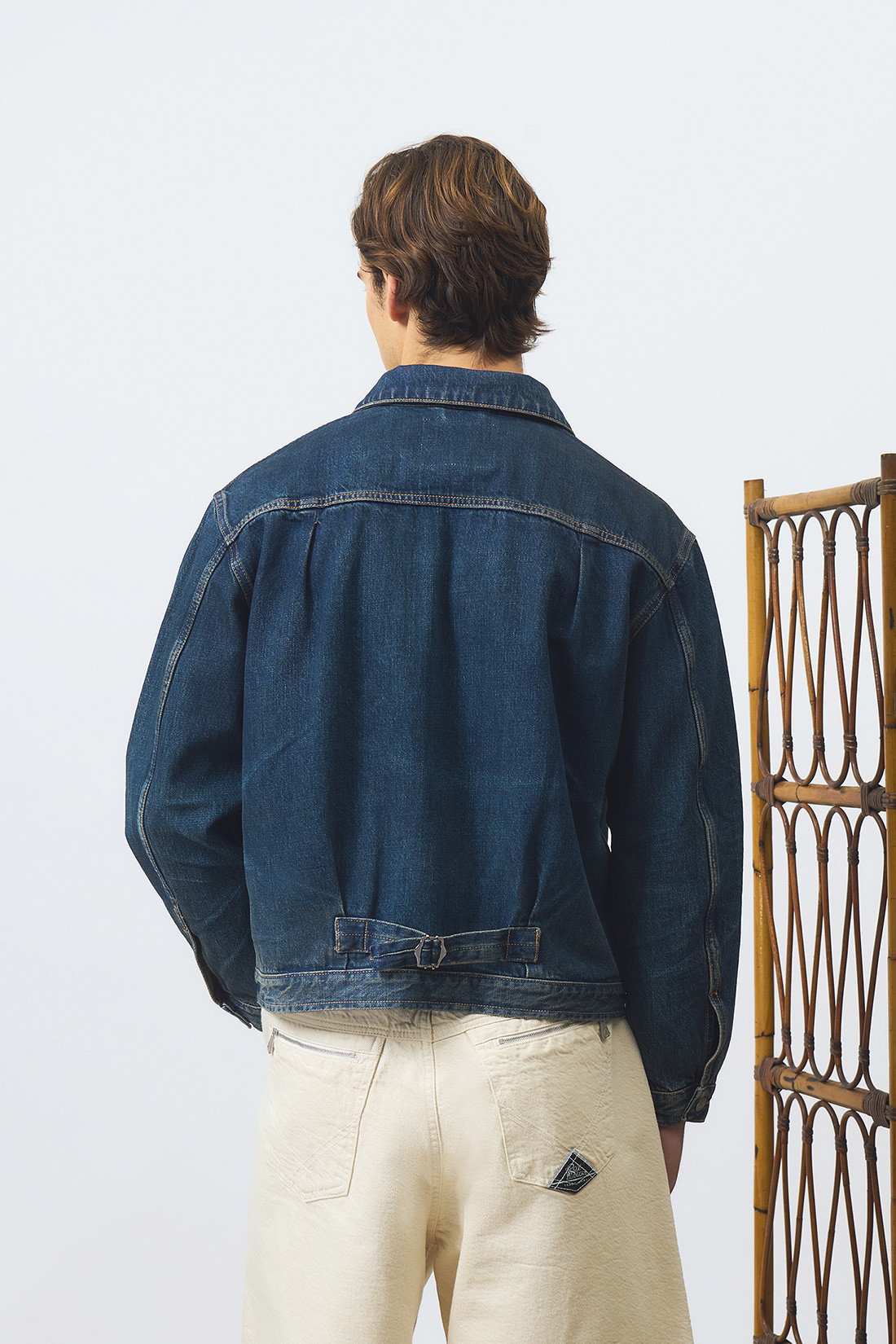 - Giacca in denim Re-search con lavaggio scuro e impunture in contrasto.