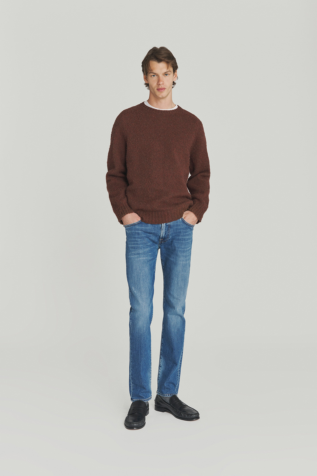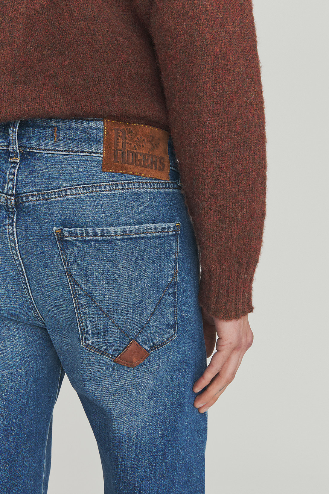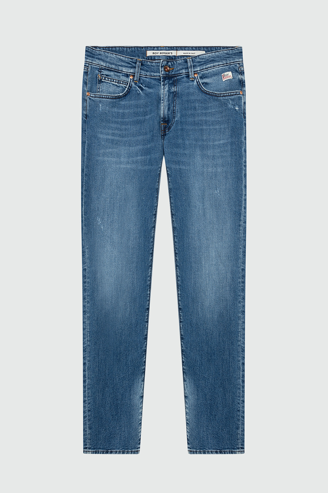 - Jeans in denim con lavaggio medio e leggere baffature sul fronte.