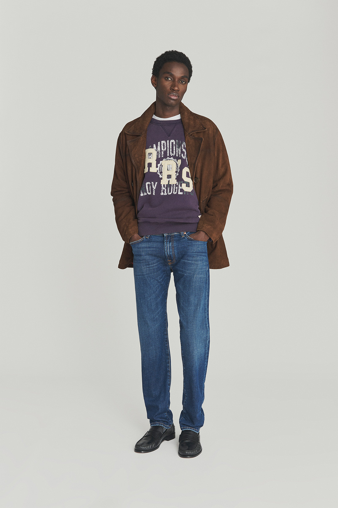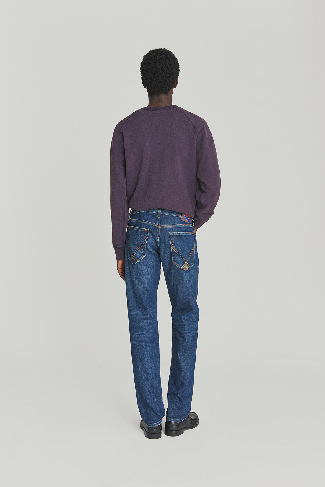 - Jeans in denim con lavaggio scuro e impunture in contrasto.
