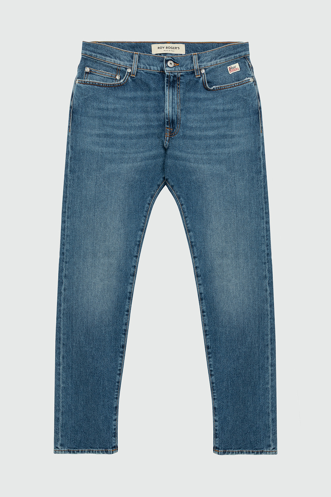 - Jeans in denim con lavaggio medio, leggere baffature sul fronte e leggero effetto used.
