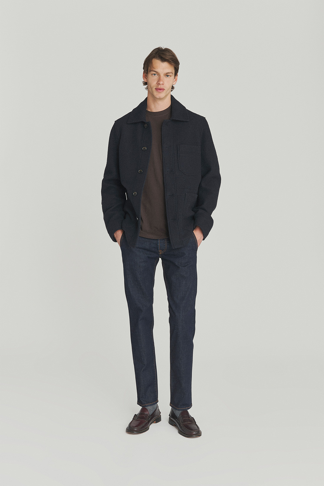 - Jeans in denim con lavaggio scuro e impunture in contrasto.
